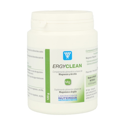 Ergyclean de Nutergia contiene ingredientes fundamentales como el sulfato de magnesio (apoya la detoxificación de los intestinos), carbonato de magnesio (suave efecto laxante y detoxificante), citrato de magnesio (gran aporte de magnesio y desacidificante), arcilla verde francesa (absorbe las toxinas del tracto gastrointestinal) y el ácido málico (detoxificante y alcalinizante).